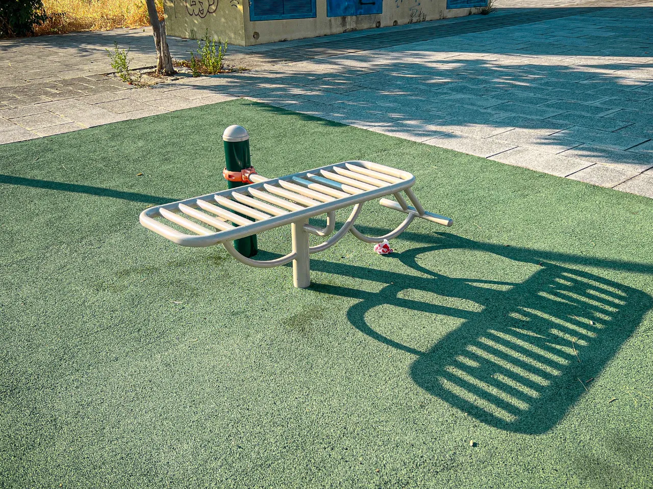 El suelo es de césped un poco duro, aunque en general irá bien para ejercicios de movilidad y para ejercicios de balance o pinos, tendrás que encontrar zonas que estén rectas. Alrededor hay sitio donde poder dejar tus cosas.