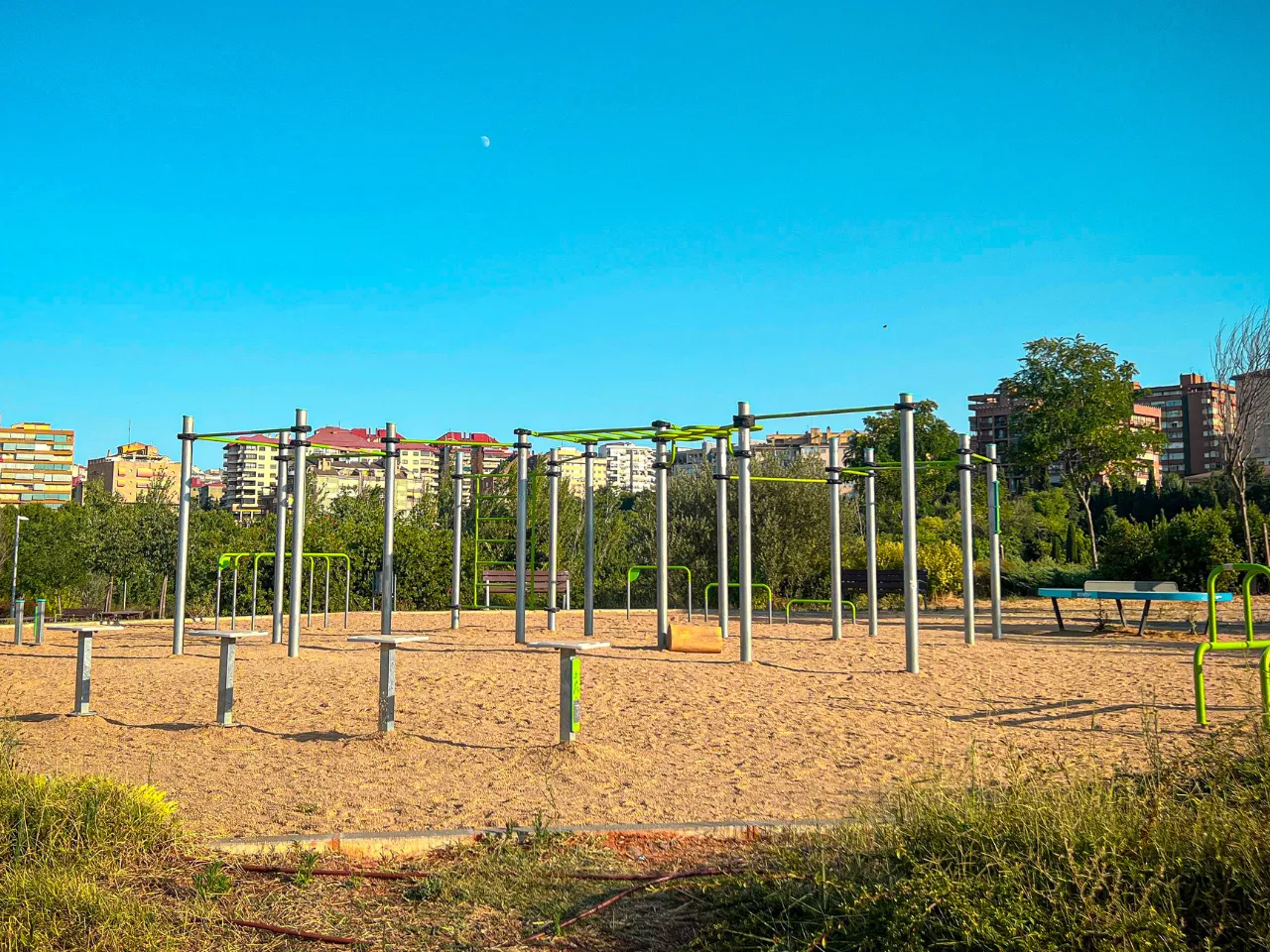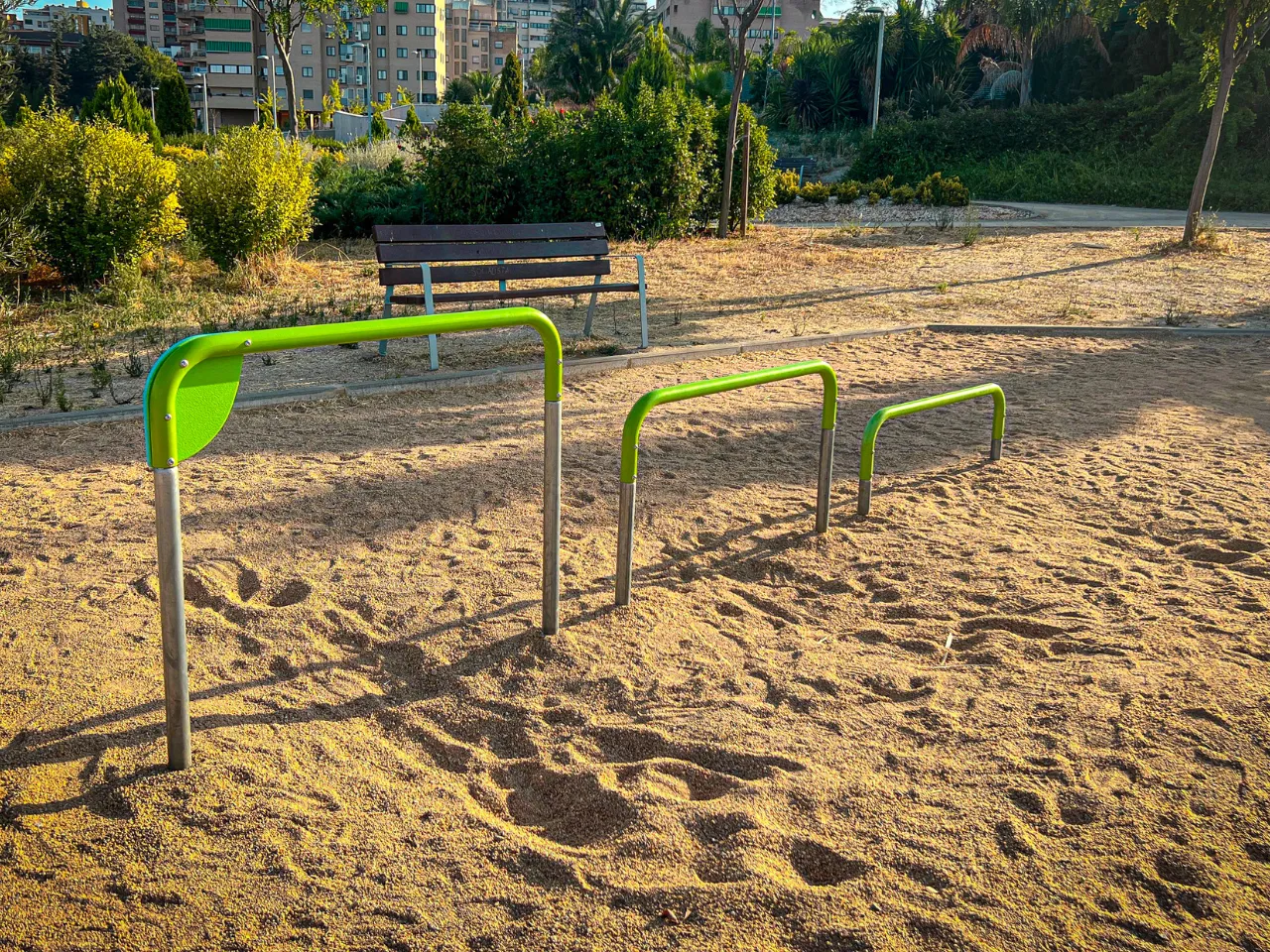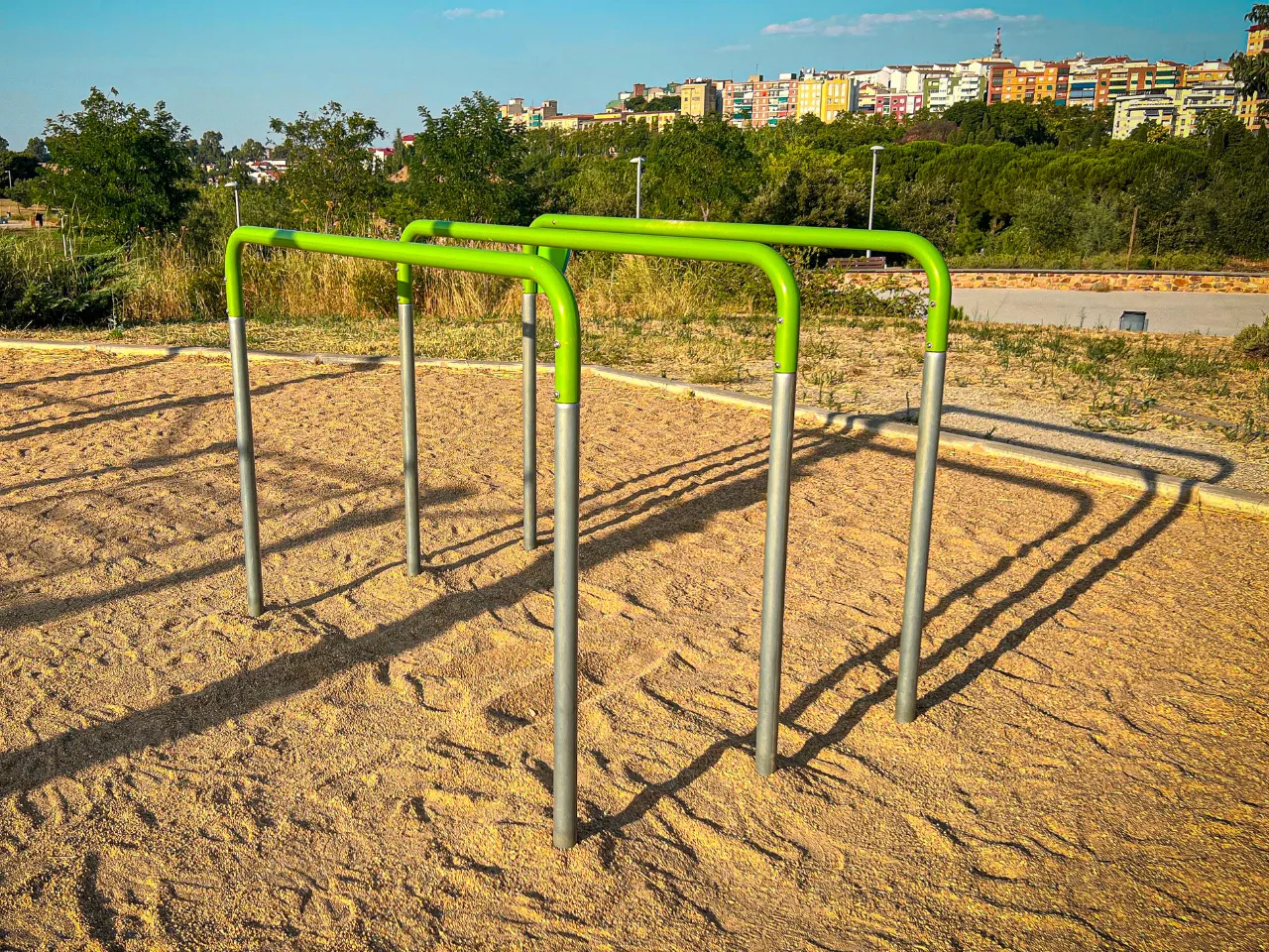 El sitio está sobre un suelo de arena duro, lo que va a dificultar los ejercicios de movilidad, aunque para ejercicios de balance o pinos, no es lo más agradable, así que tendrás que encontrar zonas que estén rectas o bien practicarlo en alguna acera cercana. Alrededor hay sitio donde poder dejar tus cosas, y el lugar ofrece espacio suficiente para moverte con libertad.