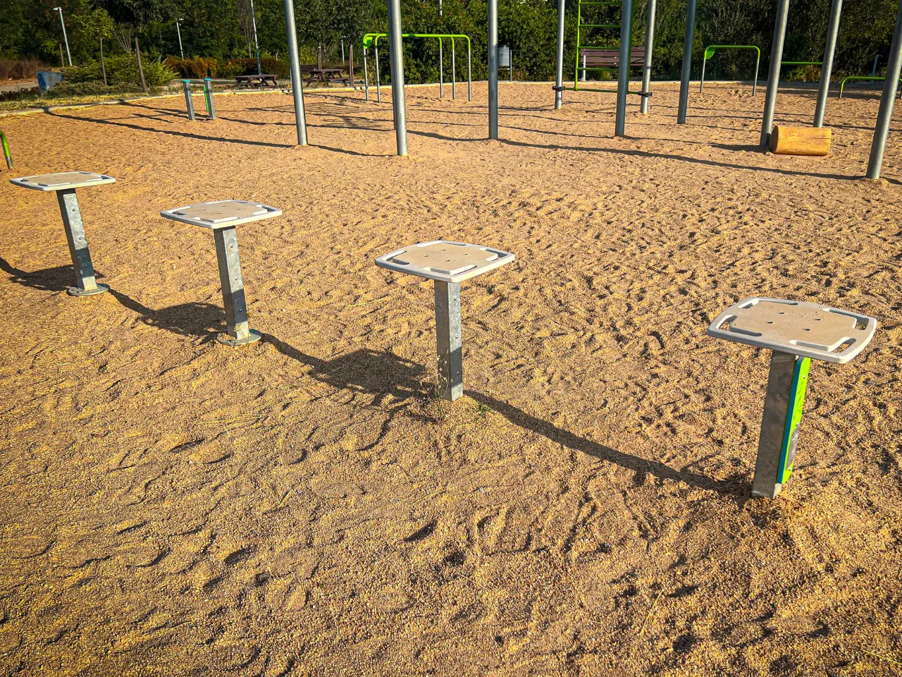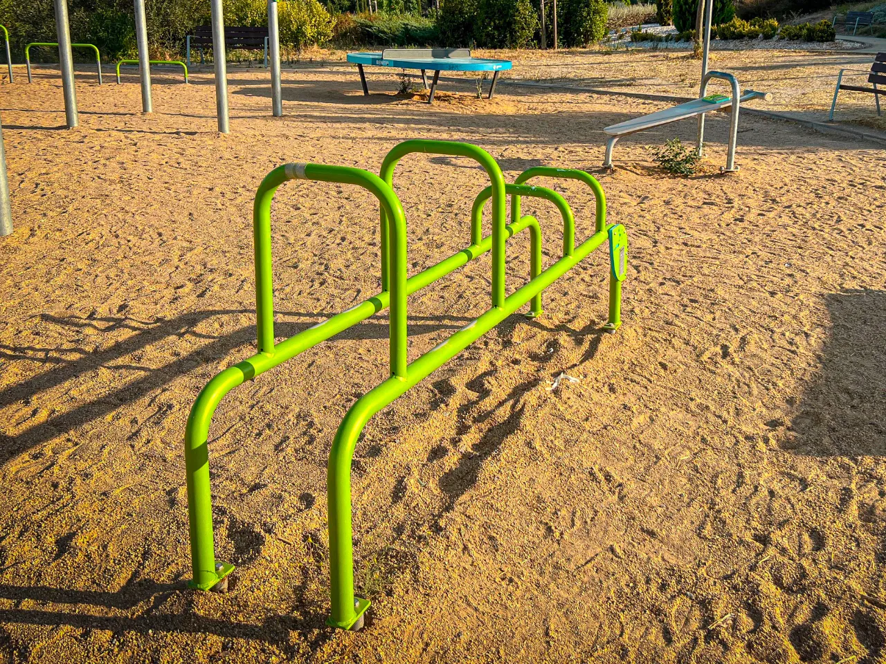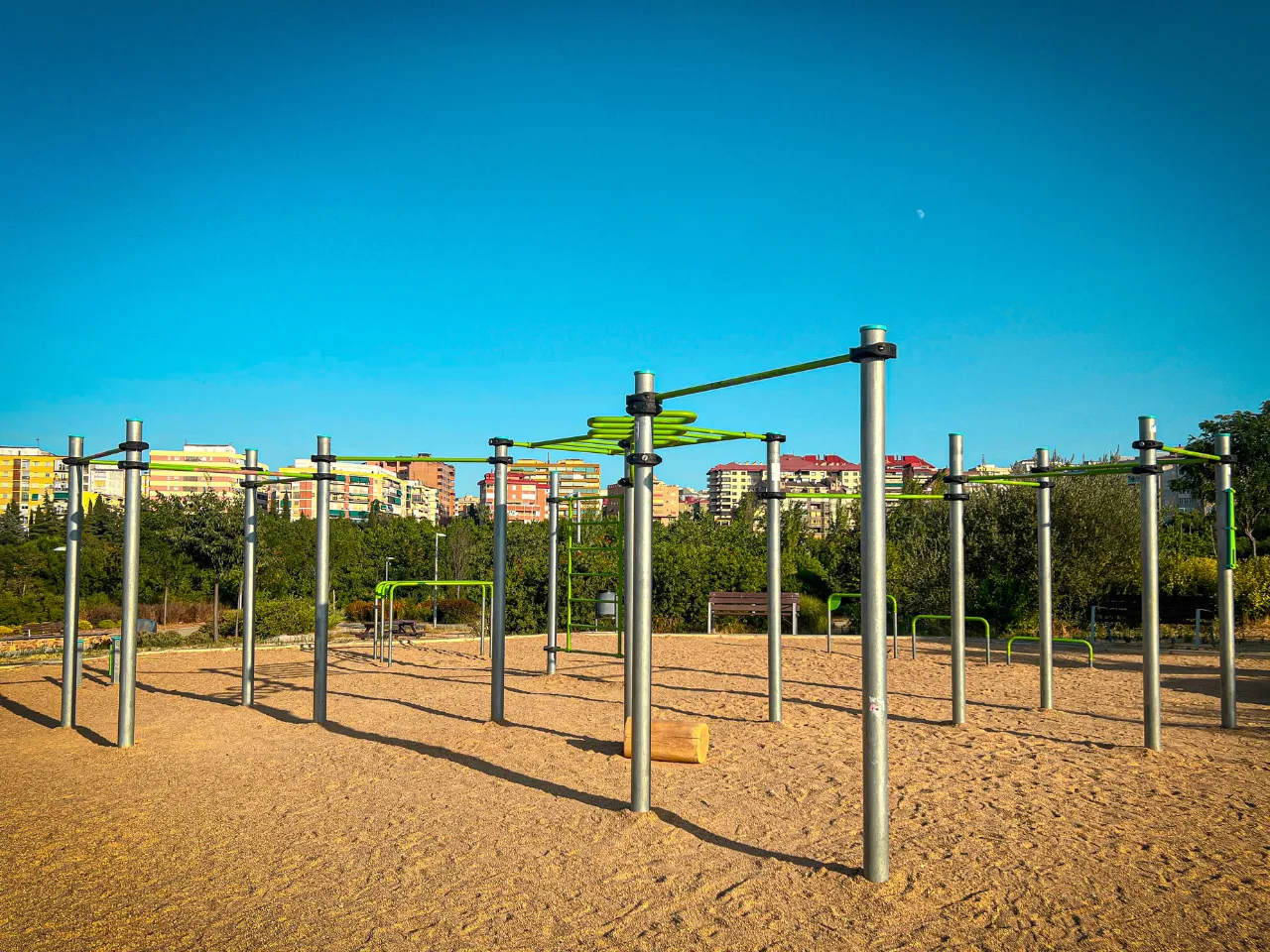 El sitio está sobre un suelo de arena duro, lo que va a dificultar los ejercicios de movilidad, aunque para ejercicios de balance o pinos, no es lo más agradable, así que tendrás que encontrar zonas que estén rectas o bien practicarlo en alguna acera cercana. Alrededor hay sitio donde poder dejar tus cosas, y el lugar ofrece espacio suficiente para moverte con libertad.