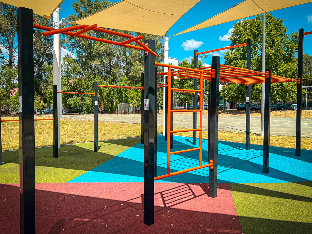 En su instalación nos encontramos con anillas, cuerda y barras de dominadas, una doble barra baja, una espaldera o pared sueca unida a barras monkey, una paralela baja, una triple barra francesa unida a una barra snake y un banco abdominal.