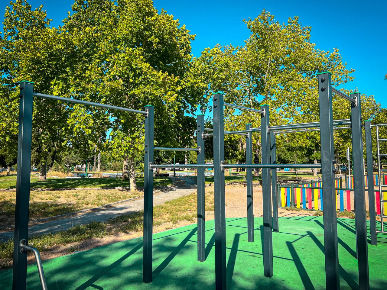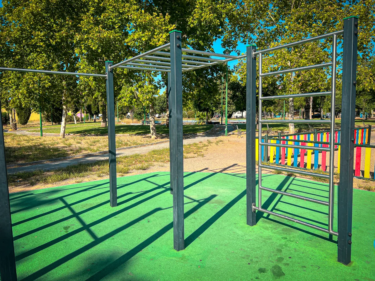 El parque cuenta con un complejo de barras para dominadas a diferentes alturas unidas a barras monkey y una espaldera o pared sueca. Además de paralelas de suelo, una triple barra francesa y una triple paralela.
