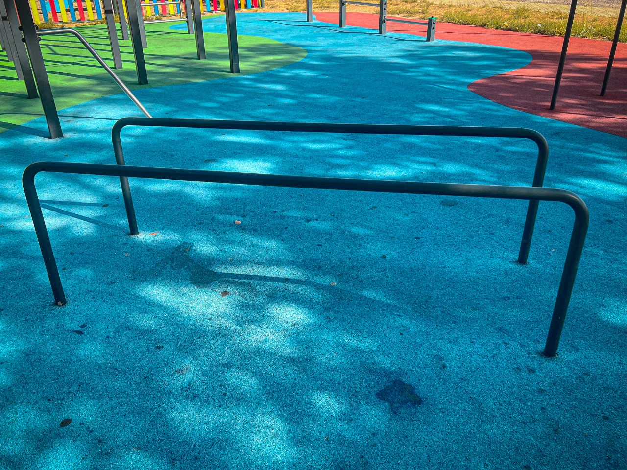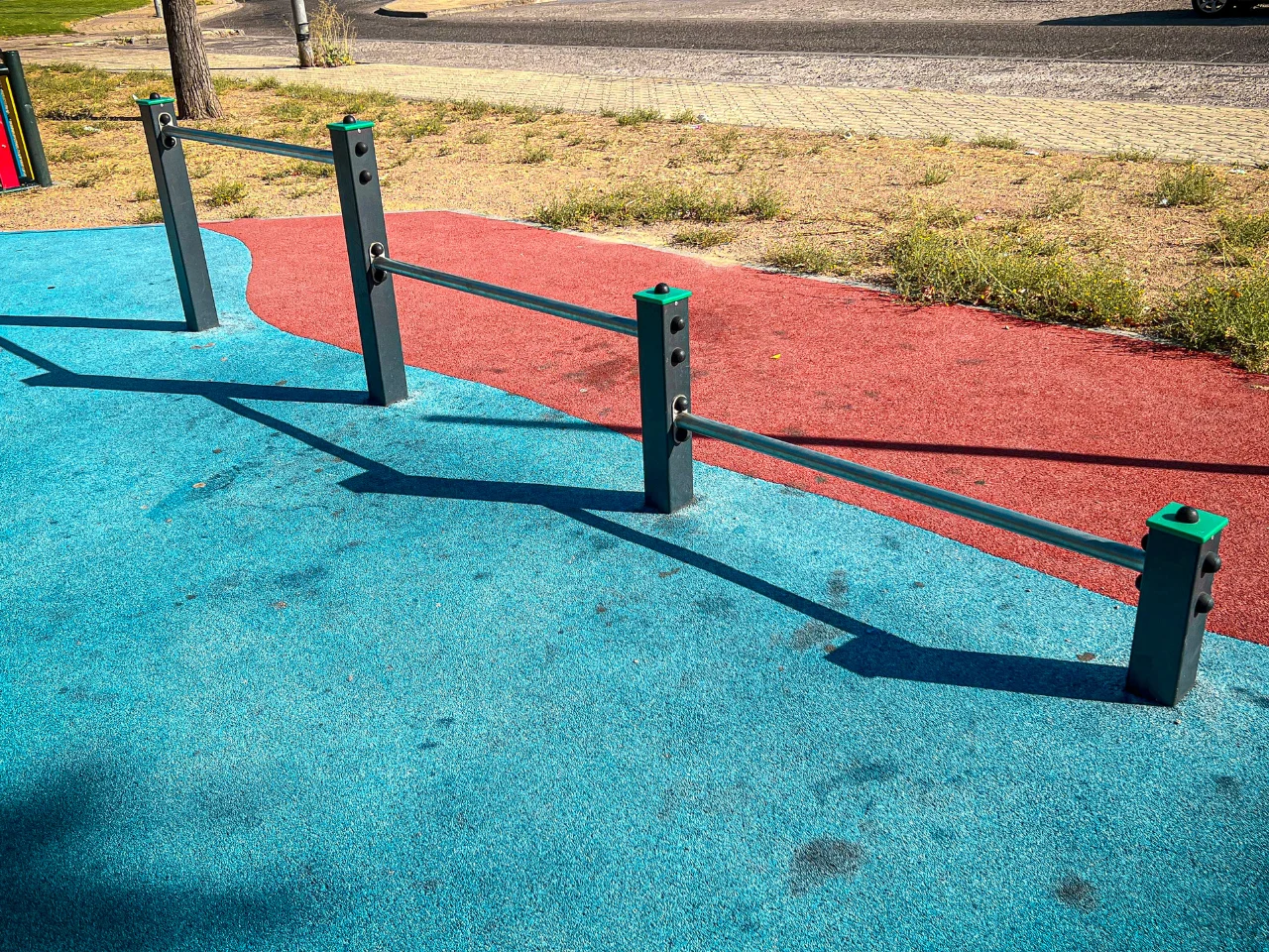 Las barras de este parque están fabricadas por alguna empresa que desconocemos. La calidad de las barras es aceptable, sus acabados también, aunque las barras parecen resbaladizas y la distancia de seguridad podría ser mejor, por lo que hacer dinámicos va a ser complicado.