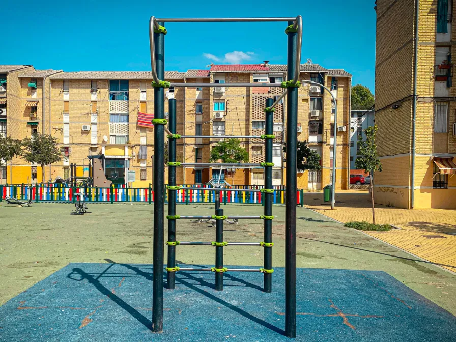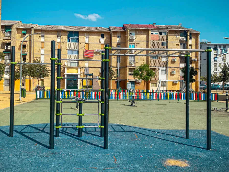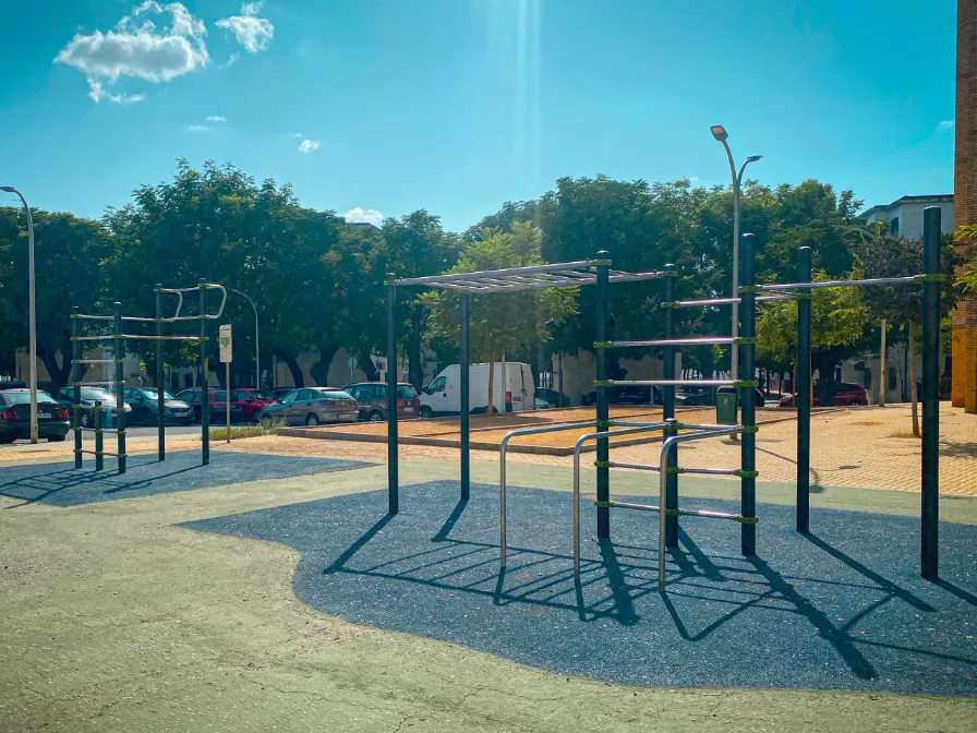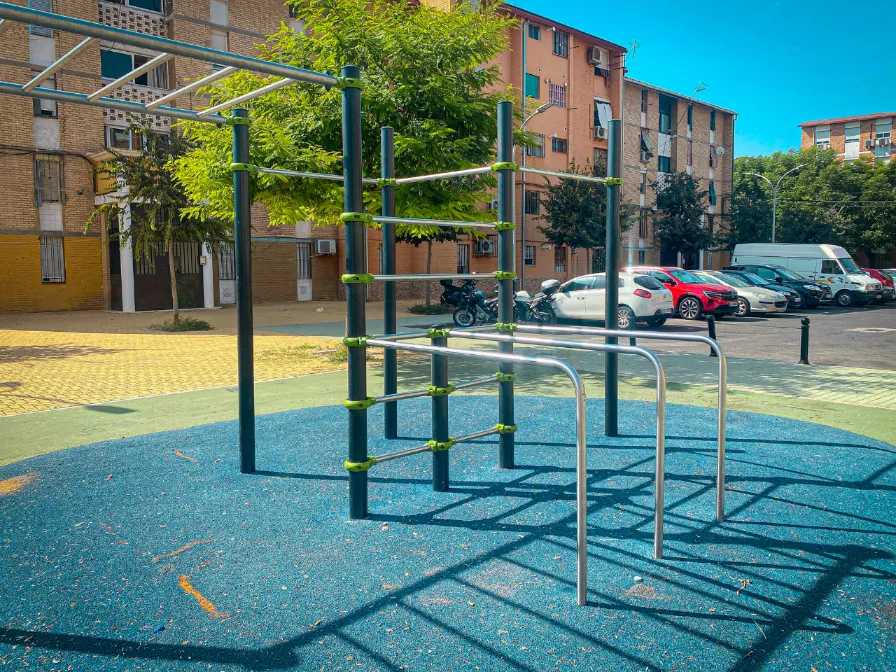 El parque cuenta con un complejo de barras para dominadas unido a una pared sueca. También con un complejo de barras Monkey y una pared sueca unidas a una triple barra paralela.