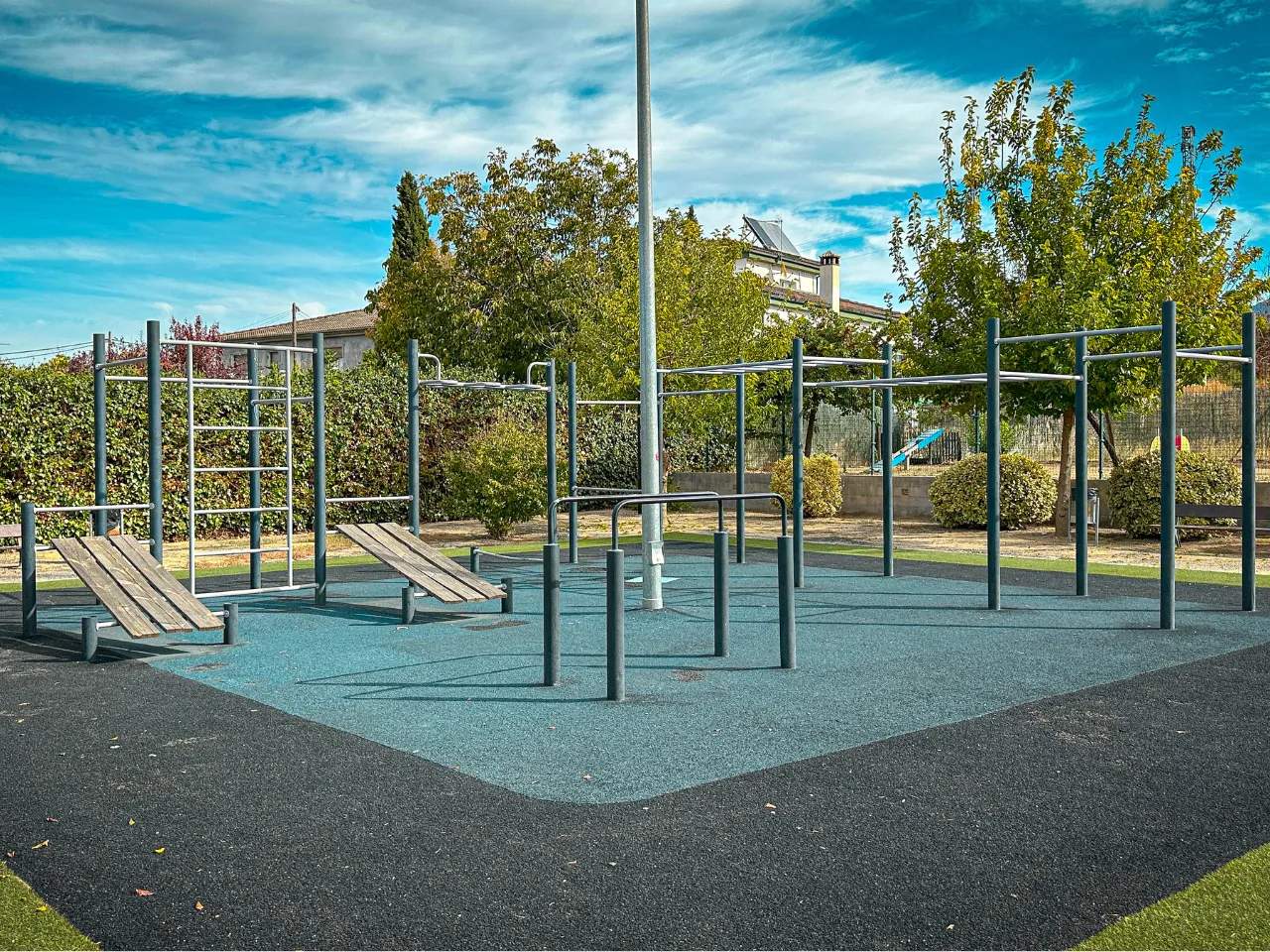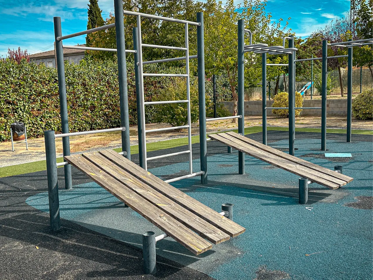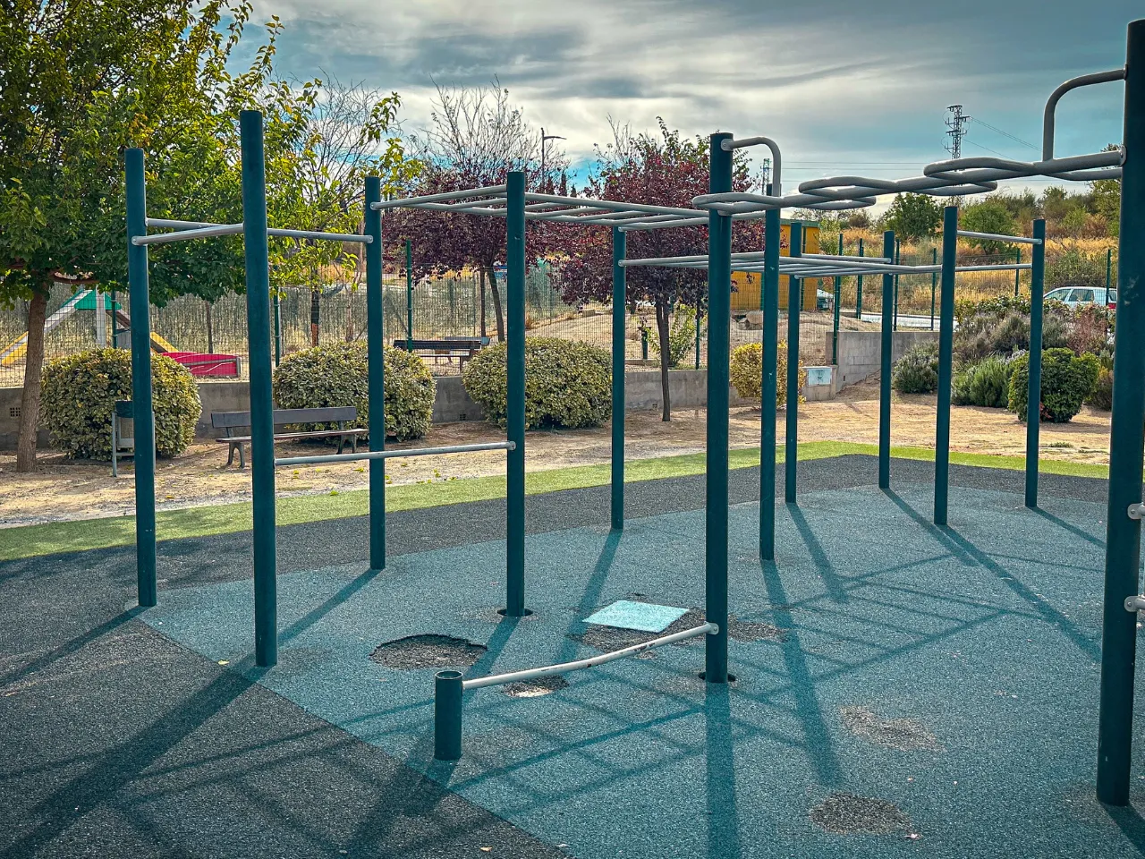 En las fotos ya puedes observar que el sitio es grande, con suelo de caucho de grano grueso (algo más abrasivo) y con algunas evidencias de desgaste sobre todo en la barra dónde se practican las Australian Pull-Ups. Al ser un sitio abierto sin toldos, sólo podrás disfrutar de la pequeña sombra que dan los árboles de alrededor, por lo que no recomendaríamos entrenar aquí con altas temperaturas.