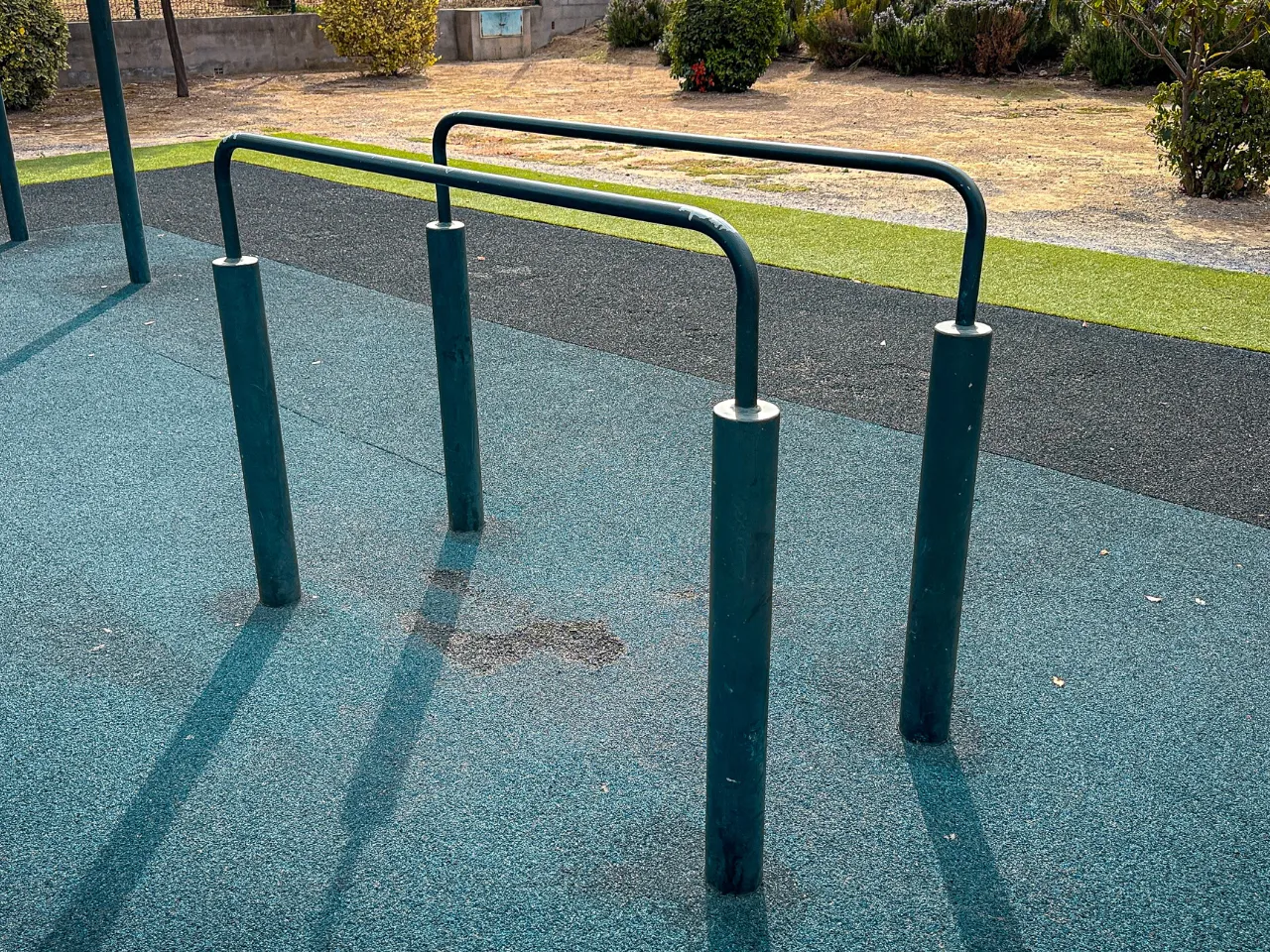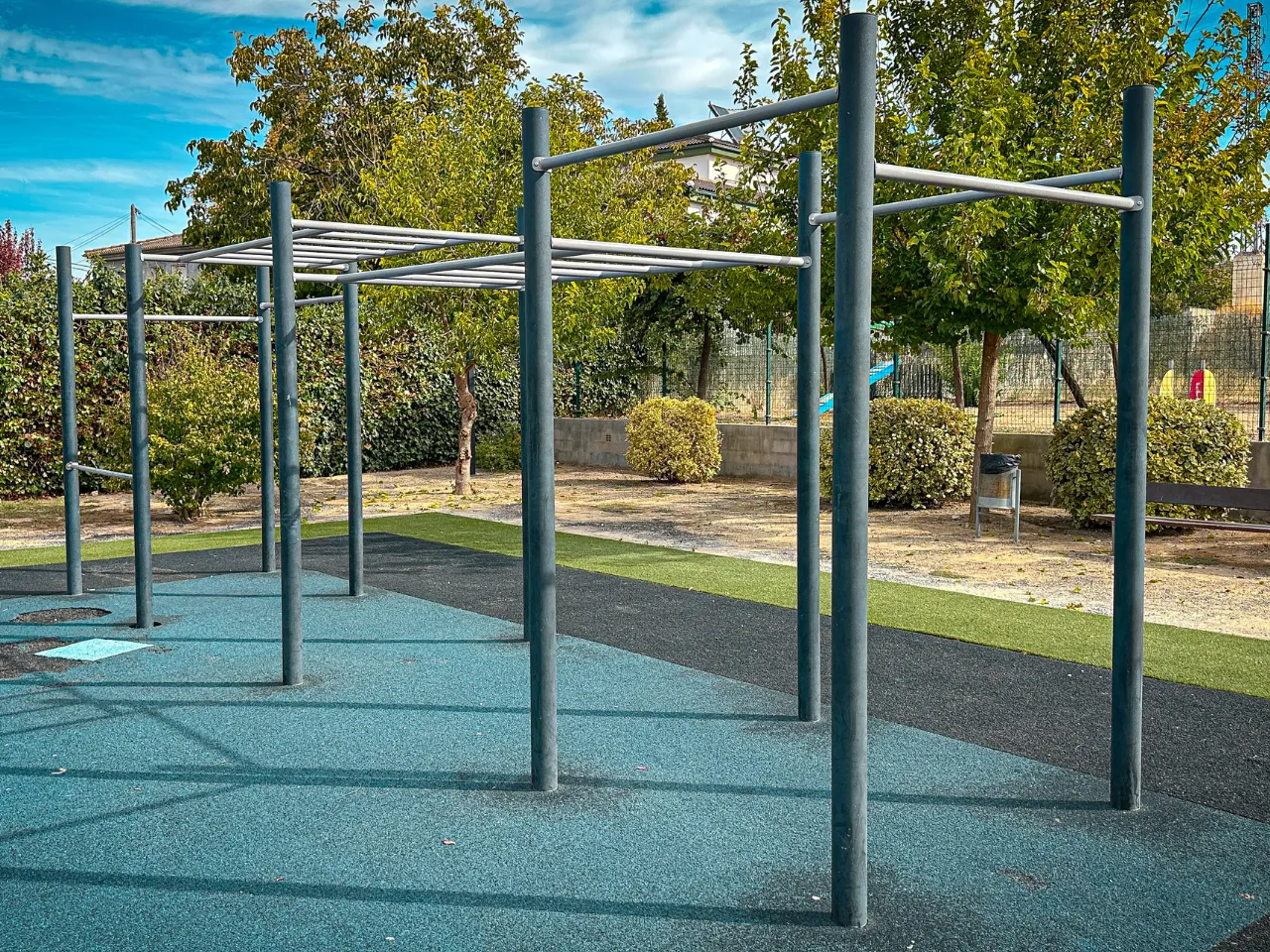 Las barras están fabricadas por la empresa Gescom Aplitec y son las mismas que nos podemos encontrar en Purchil, la Casa de la Juventud de Armilla o el polideportivo de la Zubia. Cómo ya hemos descrito en otros parques, la pintura proporciona un buen agarre para los ejercicios, pero las barras no cuentan con una buena sujeción y se caen con el tiempo. Además no cumplen con la distancia de seguridad adecuada para practicar ejercicios dinámicos.