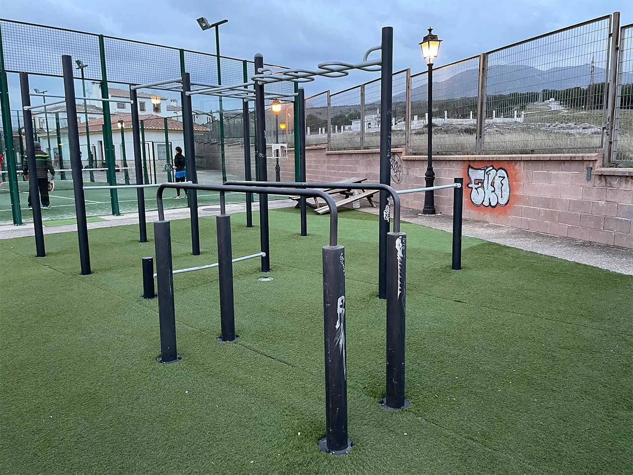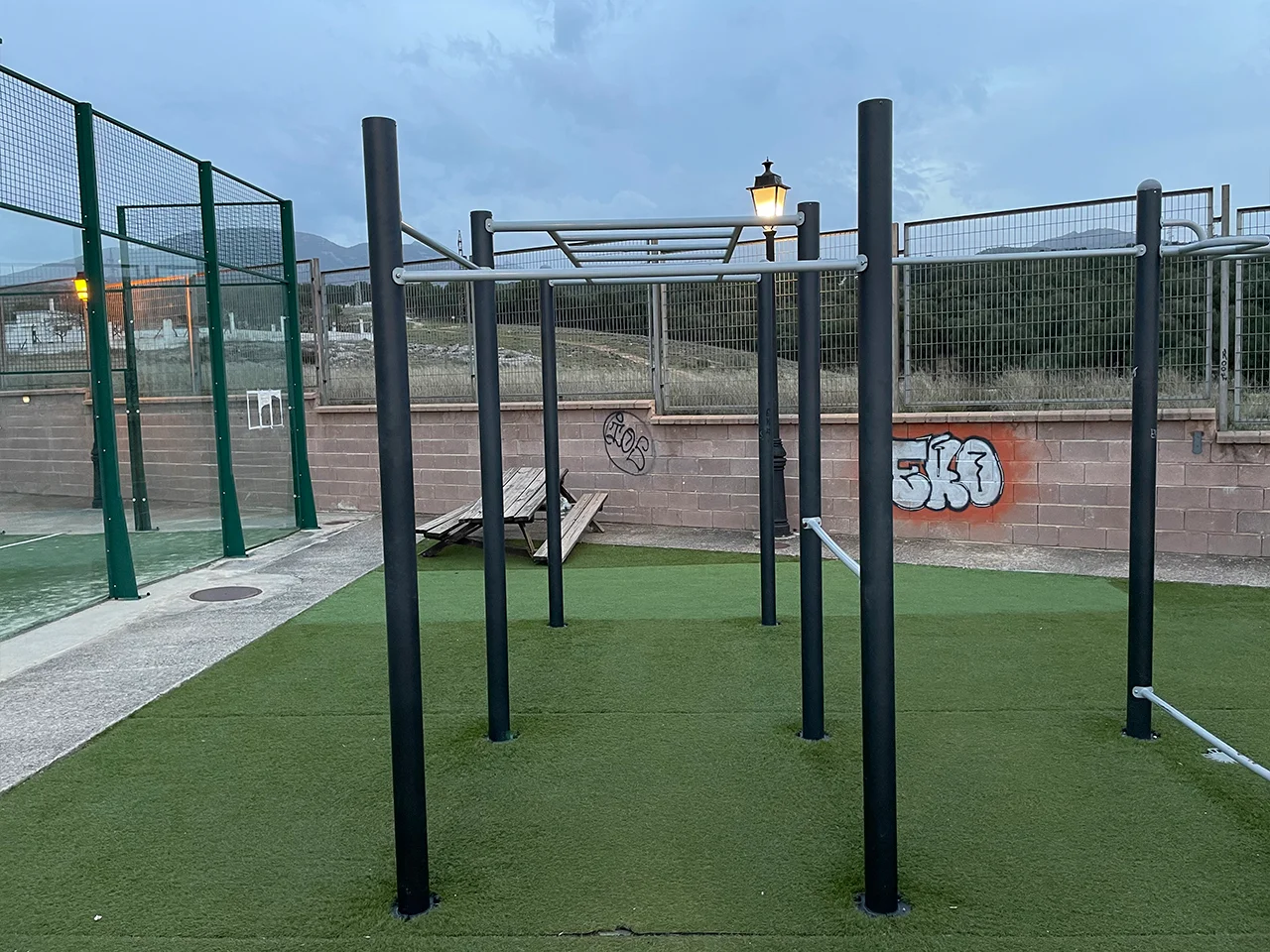 Se podría decir que este parque es un híbrido entre el parque de Las Gabias (por el pavimento de moqueta de césped) y el de la Casa de la Juventud de Armilla (por los aparatos que podrás encontrar). En este parque en concreto, echamos en falta una escalera sueca y, como ocurre en la mayoría de parques de Calistenia en Granada, una barra de FreeStyle.