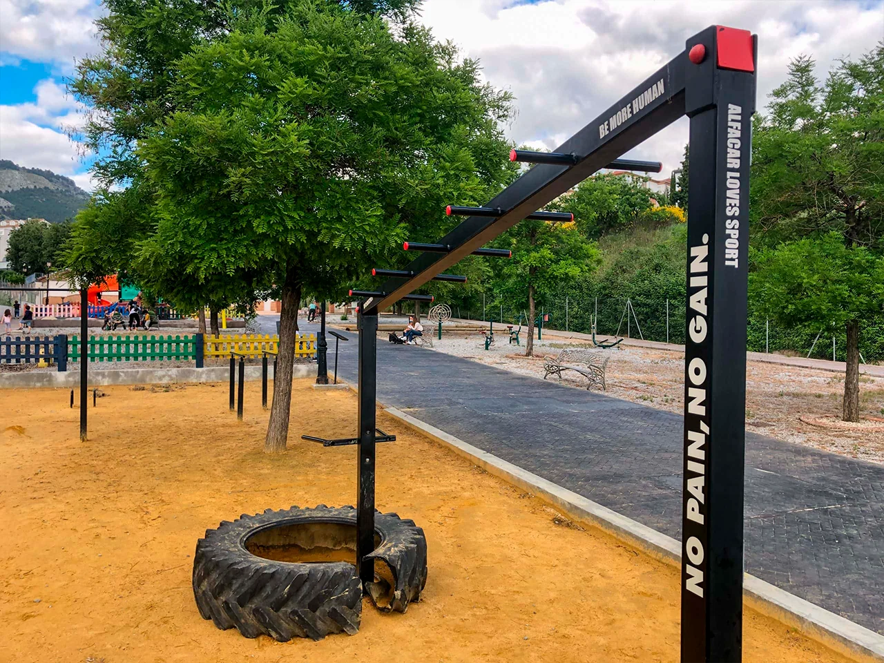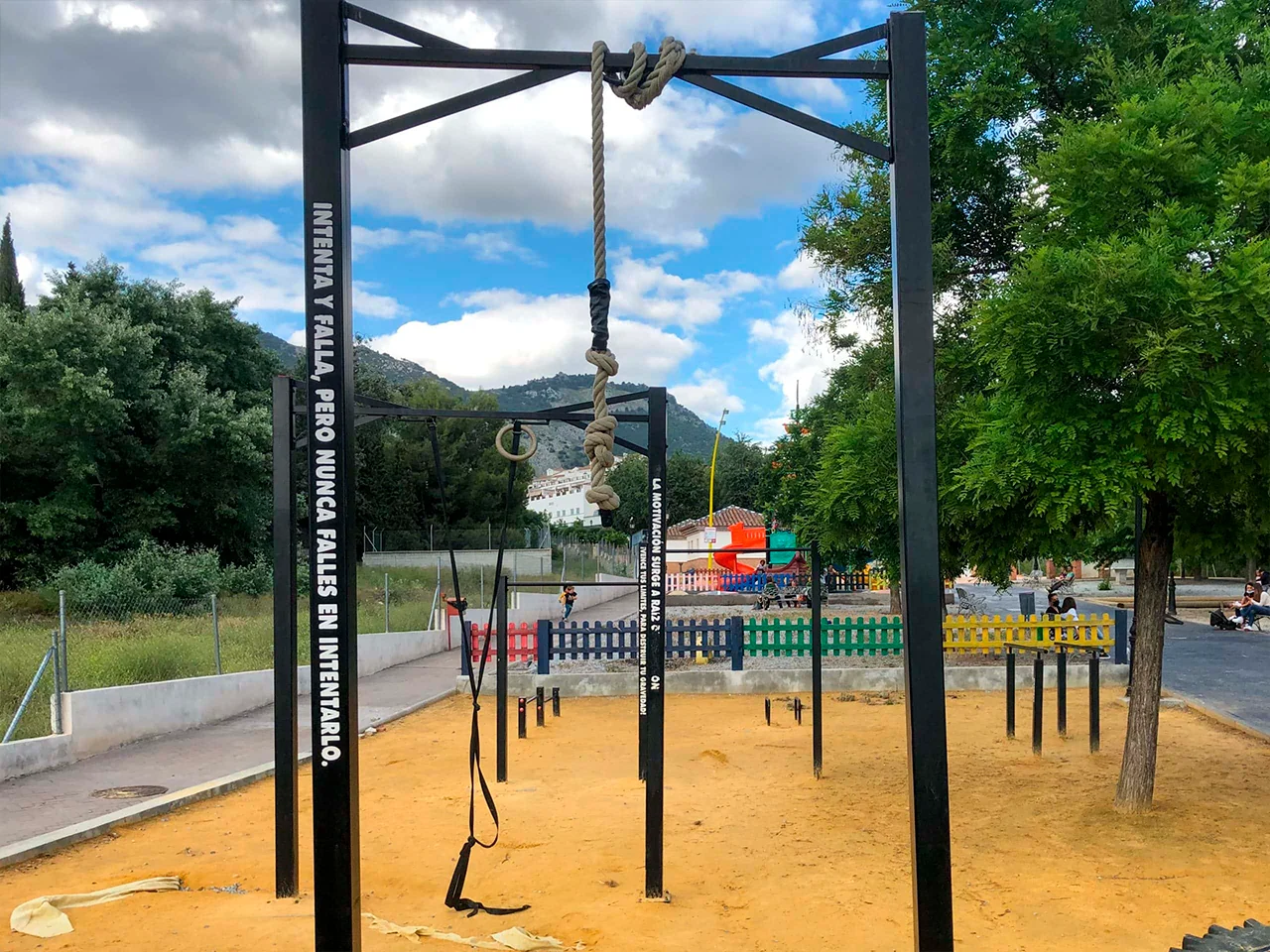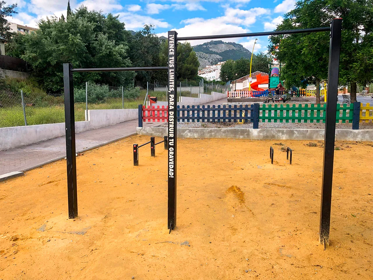 El diseño y construcción del parque es de un herrero local de la provincia cuya predisposición es el entrenamiento funcional. Al ser un parque «low cost» no cuenta con los requerimientos para realizar ejercicios más avanzados, ya que no cuentan con los puntos de fijación necesarios y la distancia de seguridad entre unas y otras no es la adecuada.
