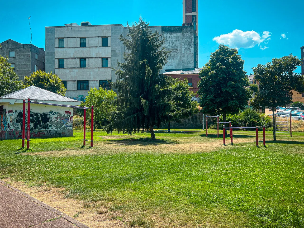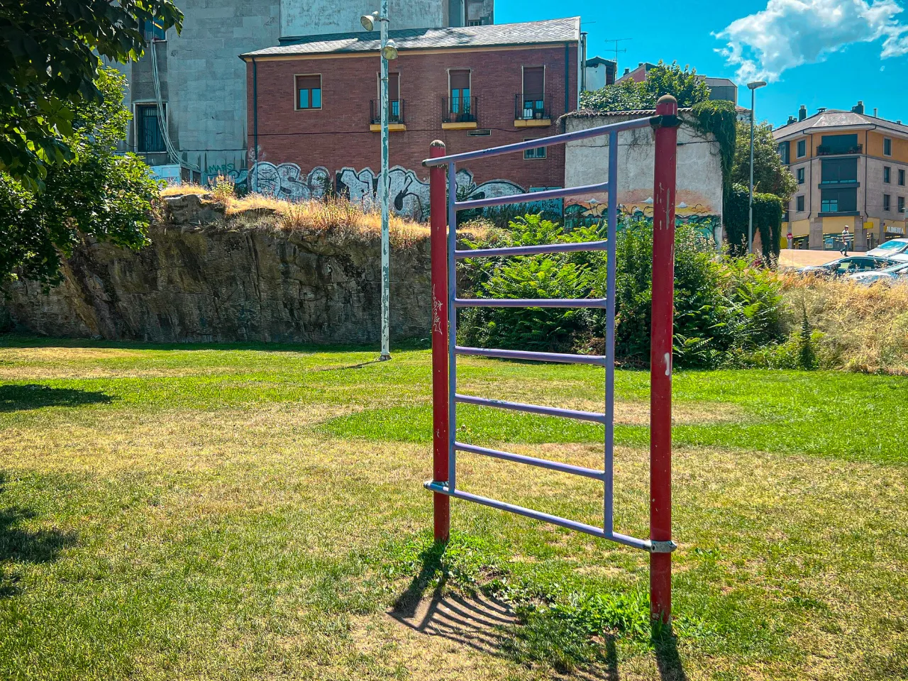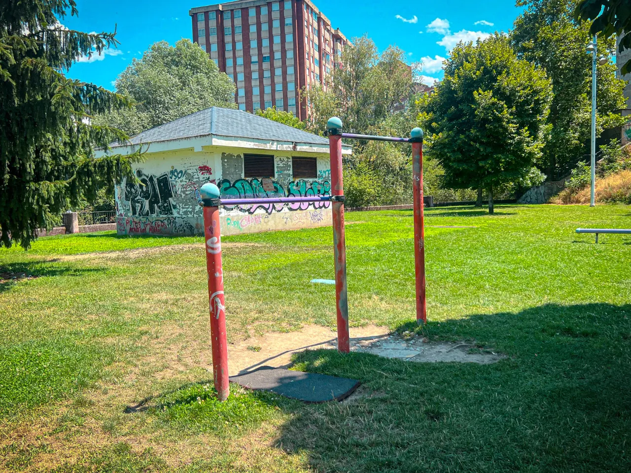 El sitio donde se encuentra el parque es tranquilo. Su ubicación rodeada de naturaleza lo hace un lugar idílico para practicar Calistenia. El suelo es duro, con mucho verde, donde hacer movilidad y flexibilidad placenteramente. Además es un buen suelo para entrenar balance o pinos, aunque tendrás que encontrar zonas que no tengan mucha grava y que estén rectas.