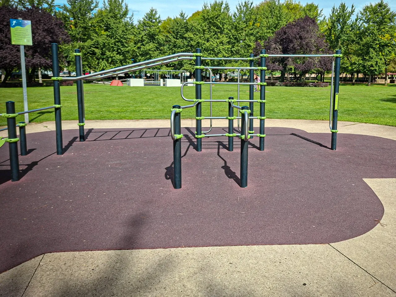 El sitio está dividido en dos ubicaciones cercanas. Las barras de una ubicación están sobre un suelo de caucho cómodo para practicar movilidad y flexibilidad. Para hacer ejercicios de balance necesitaremos algo más duro.