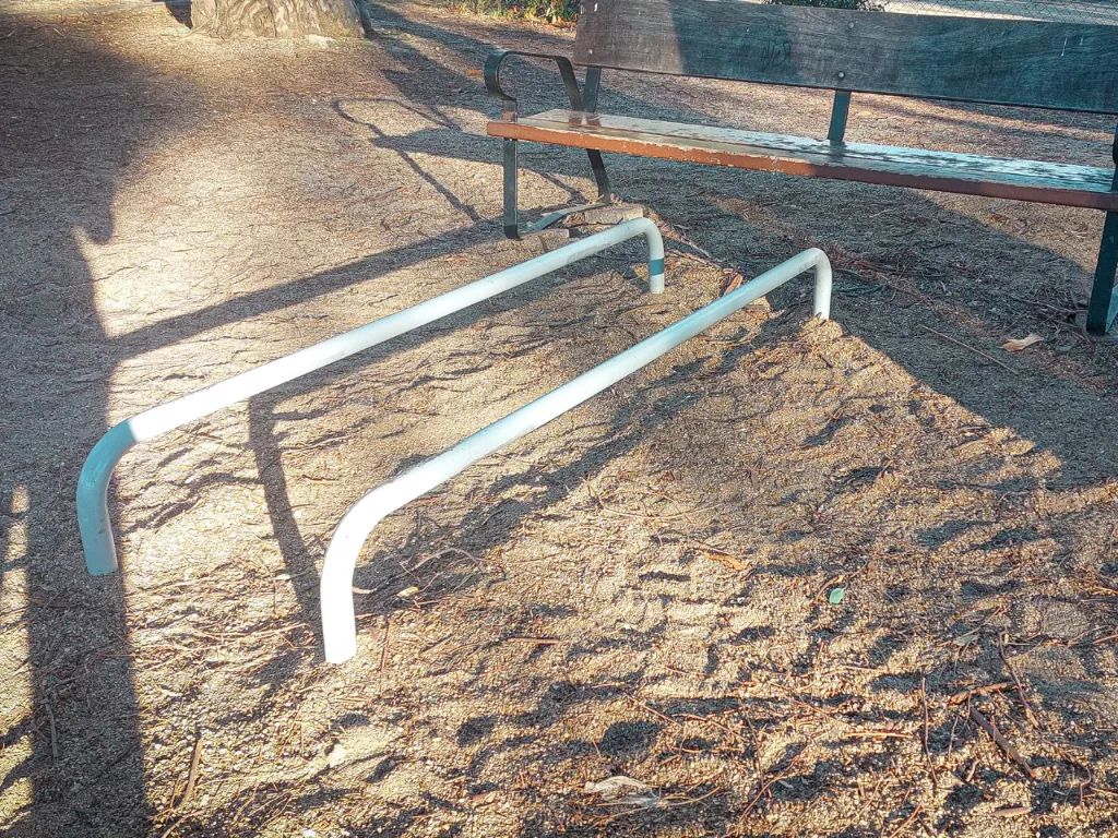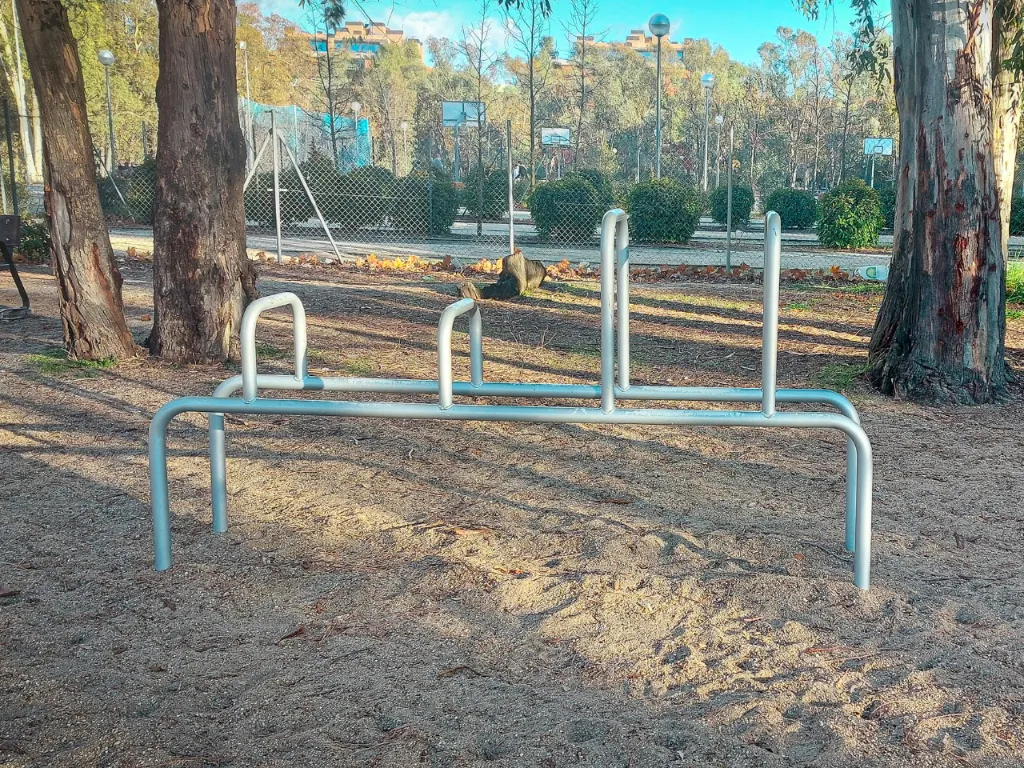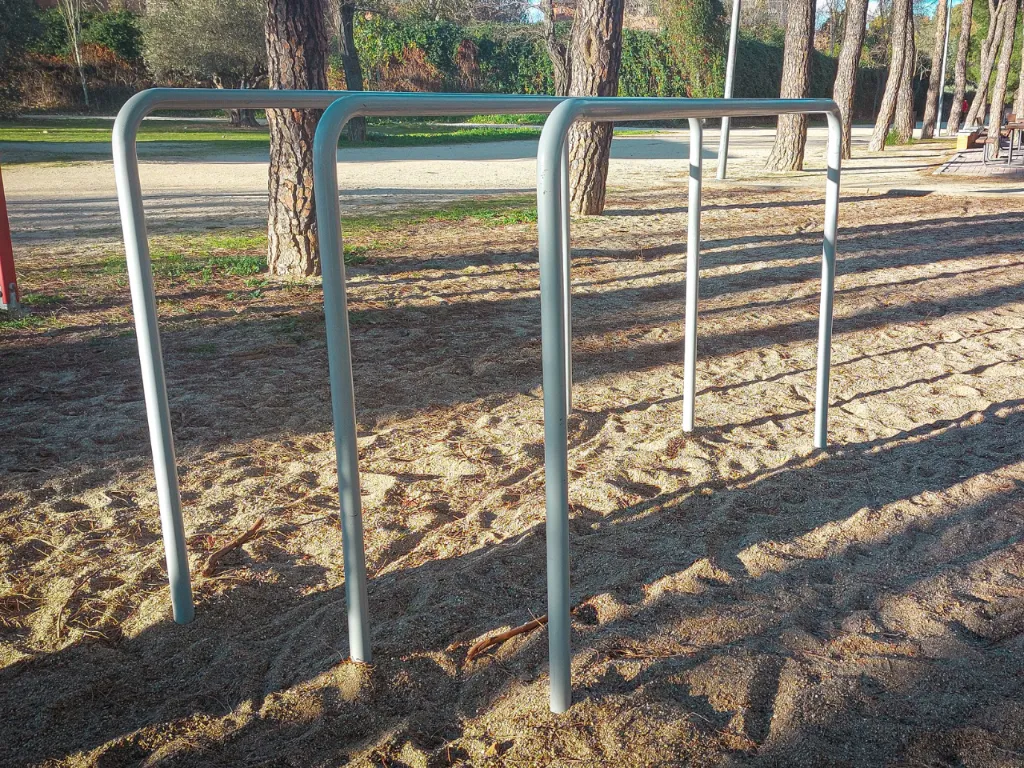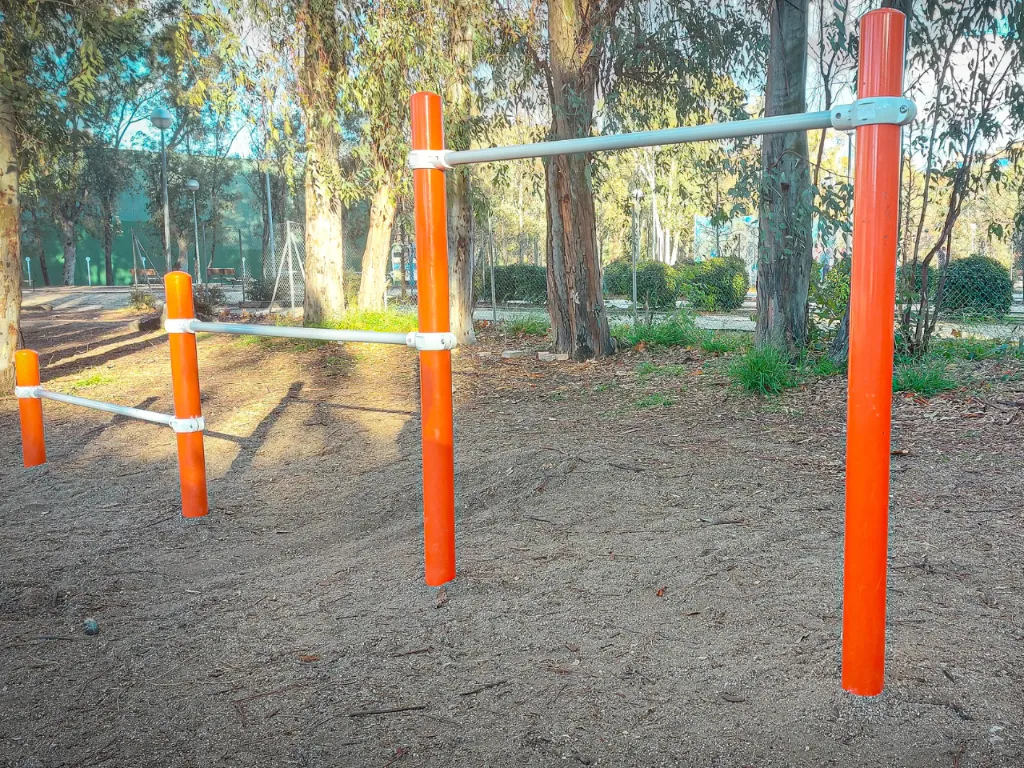 Las barras de este parque están fabricadas por alguna empresa que desconocemos. La calidad y los acabados de las barras son correctos y, además, la distancia de seguridad también es adecuada para practicar los ejercicios sin ningún problema.
