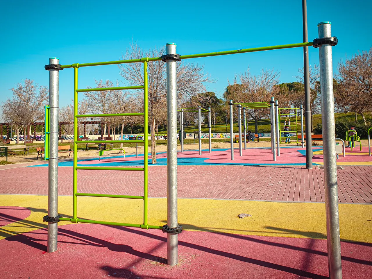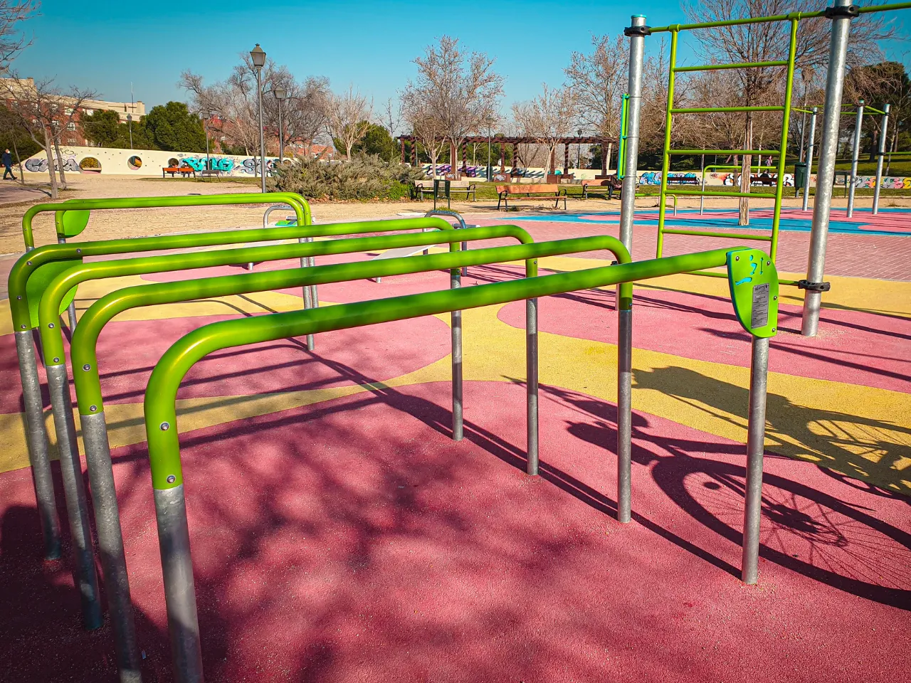 Hay zonas verdes alrededor y las barras se encuentran sobre un suelo de caucho cómodo para practicar movilidad y flexibilidad. Para hacer ejercicios de balance necesitaremos algo más duro, lo mejor es la acera.
