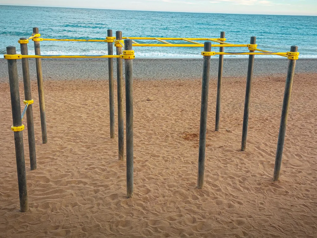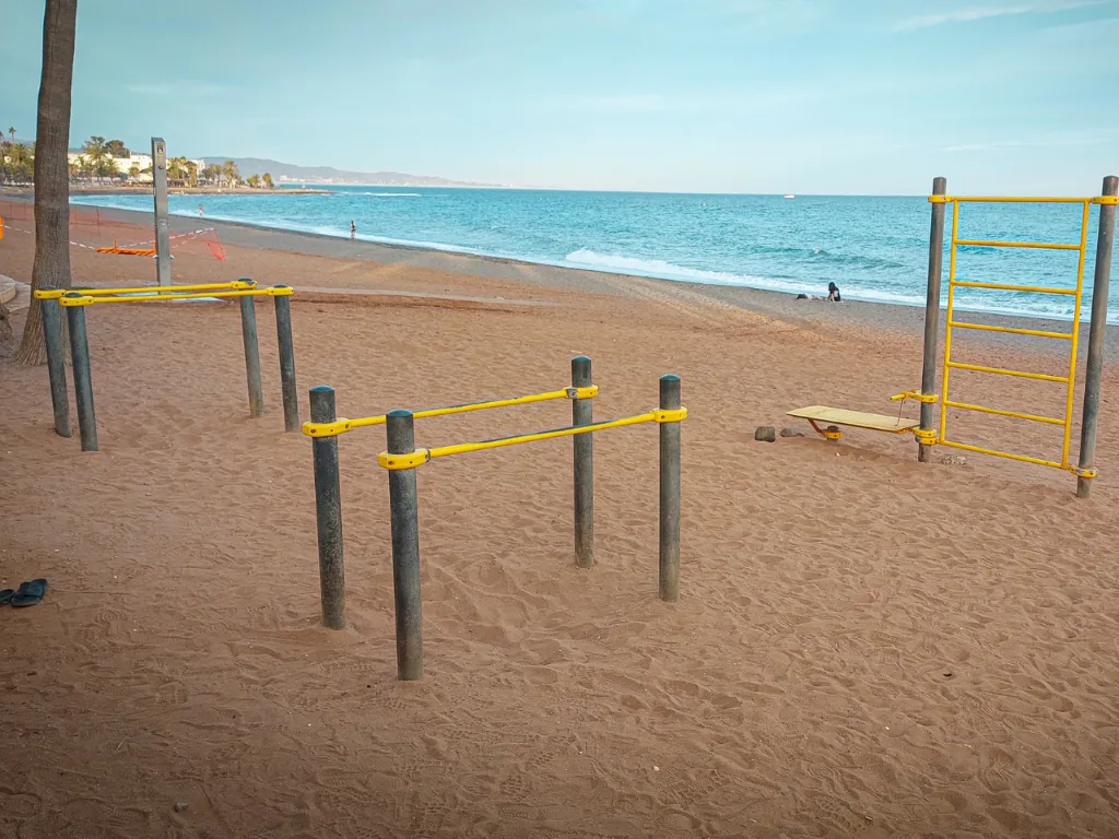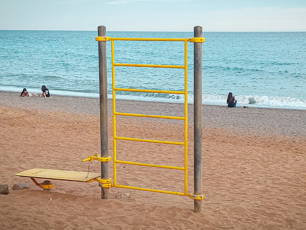 El sitio, ubicado entre el paseo marítimo y la playa, es bastante concurrido. El suelo es de arena fina, por lo que puede amortiguar de forma segura posibles caídas. También podemos ejercitar la movilidad encima de la arena y los ejercicios de balance justo en la pasarela que lleva a la playa.