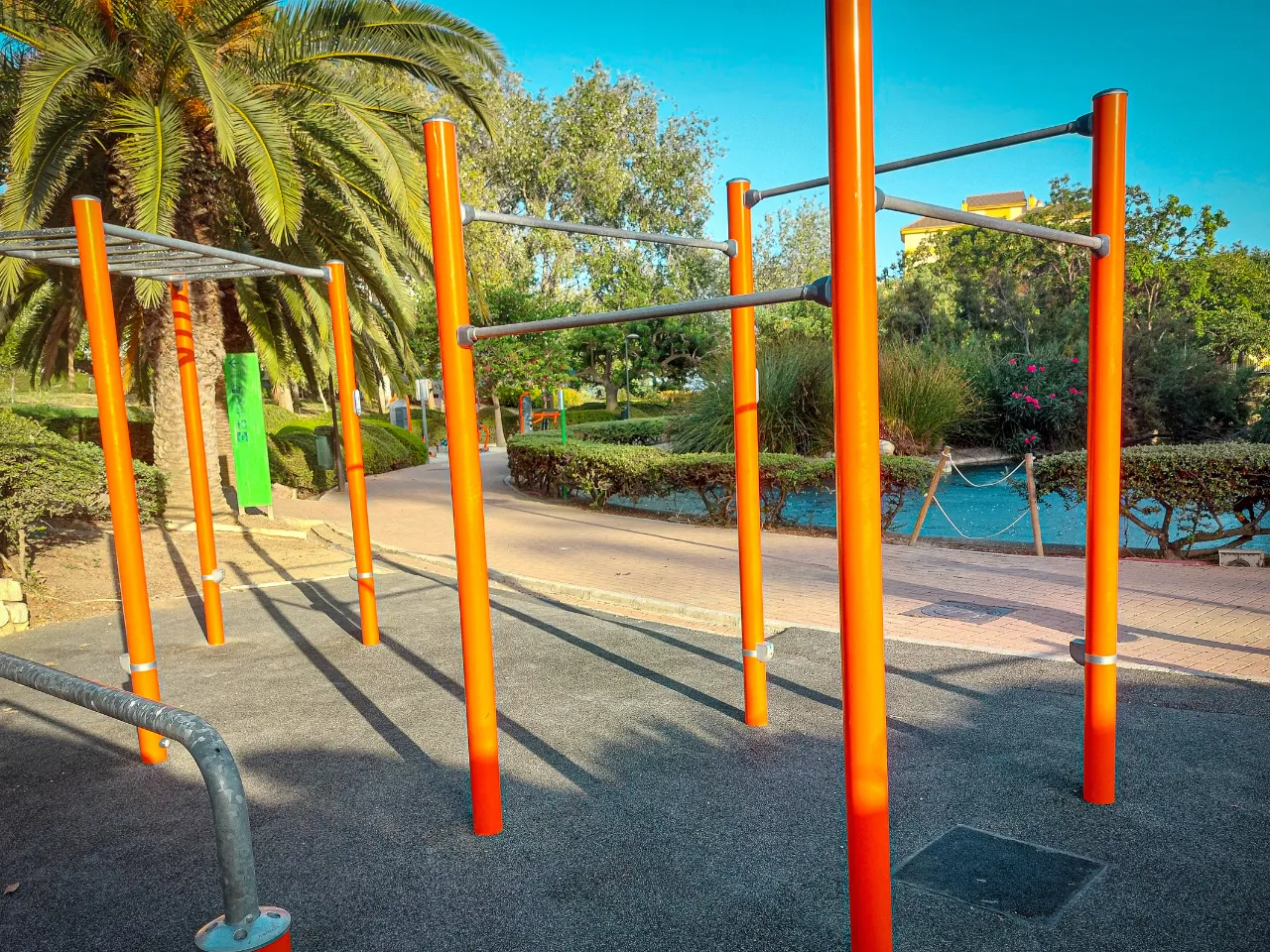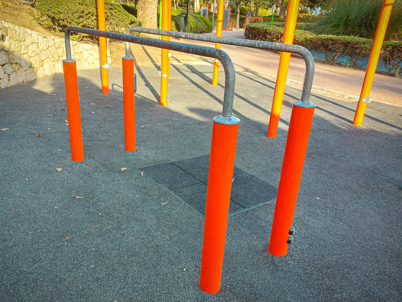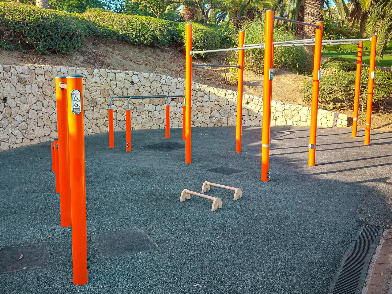 El sitio donde se encuentra el parque es tranquilo y muy acogedor, puesto que está rodeado de vegetación y esto le da siempre frescura. La instalación cuenta con un suelo de caucho que será adecuado para hacer nuestra movilidad y flexibilidad. Para hacer ejercicios de balance necesitaremos algo más duro. Lo mejor es la acera de al lado.