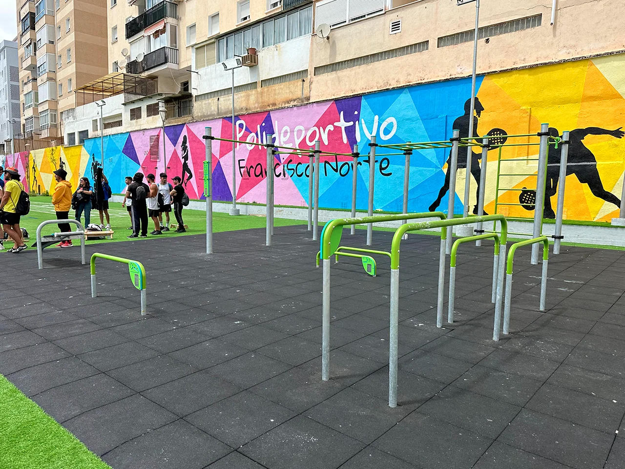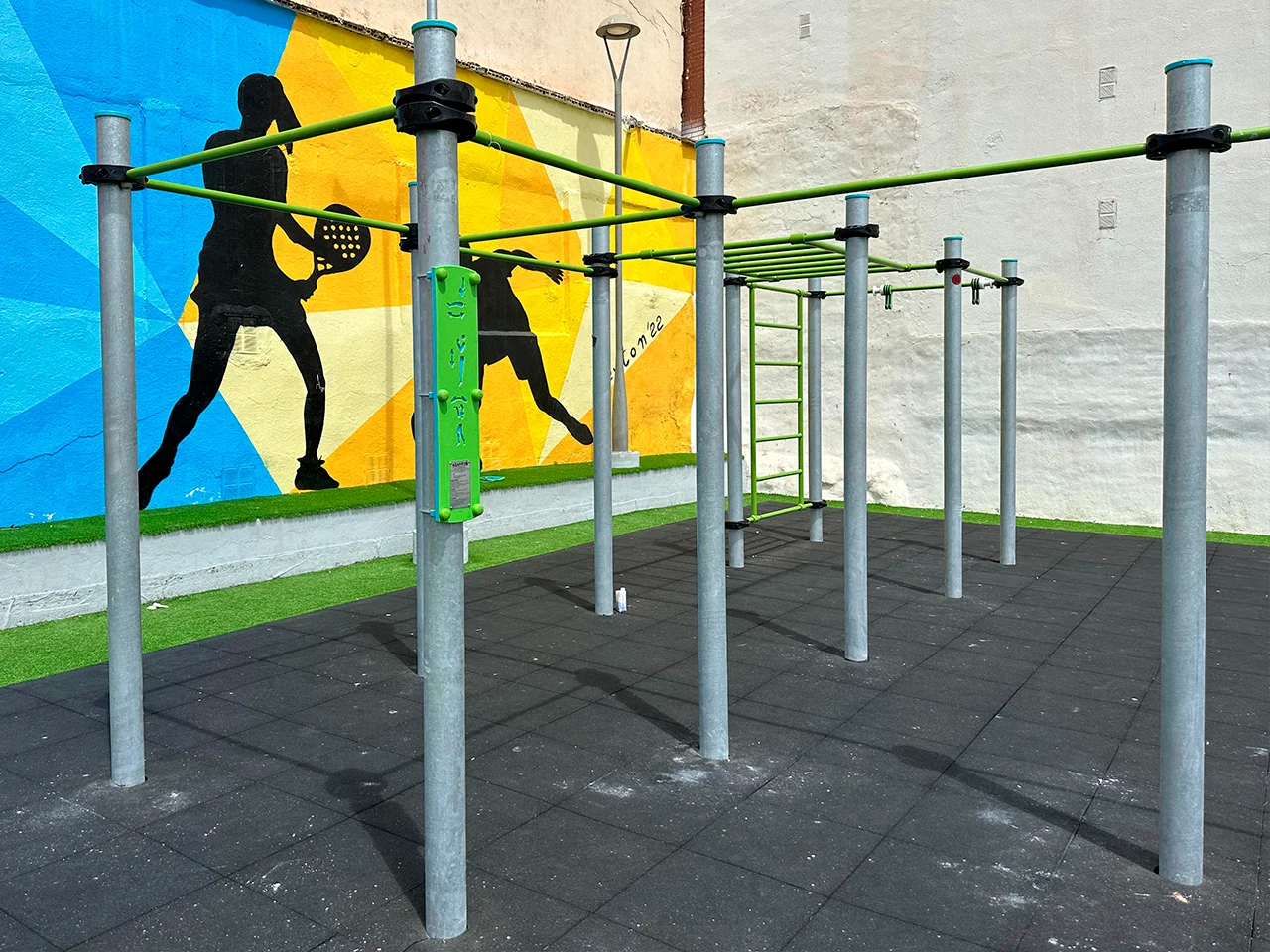 El sitio, al estar ubicado dentro del polideportivo es amplio y está bien cuidado. El suelo es de caucho y tiene césped alrededor, especialmente cómodo para realizar ejercicios de movilidad, estiramientos y balance.