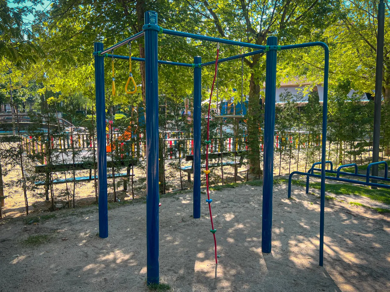 En su instalación nos encontramos con un banco abdominal y barras bajas, bancos pliométricos, barras monkey y anillas, un complejo con barras para dominadas, cuerda y barra de pol dance, una paralela a doble altura, una doble paralela unida a barras de dominadas y una triple barra baja unida a una espaldera o pared sueca.