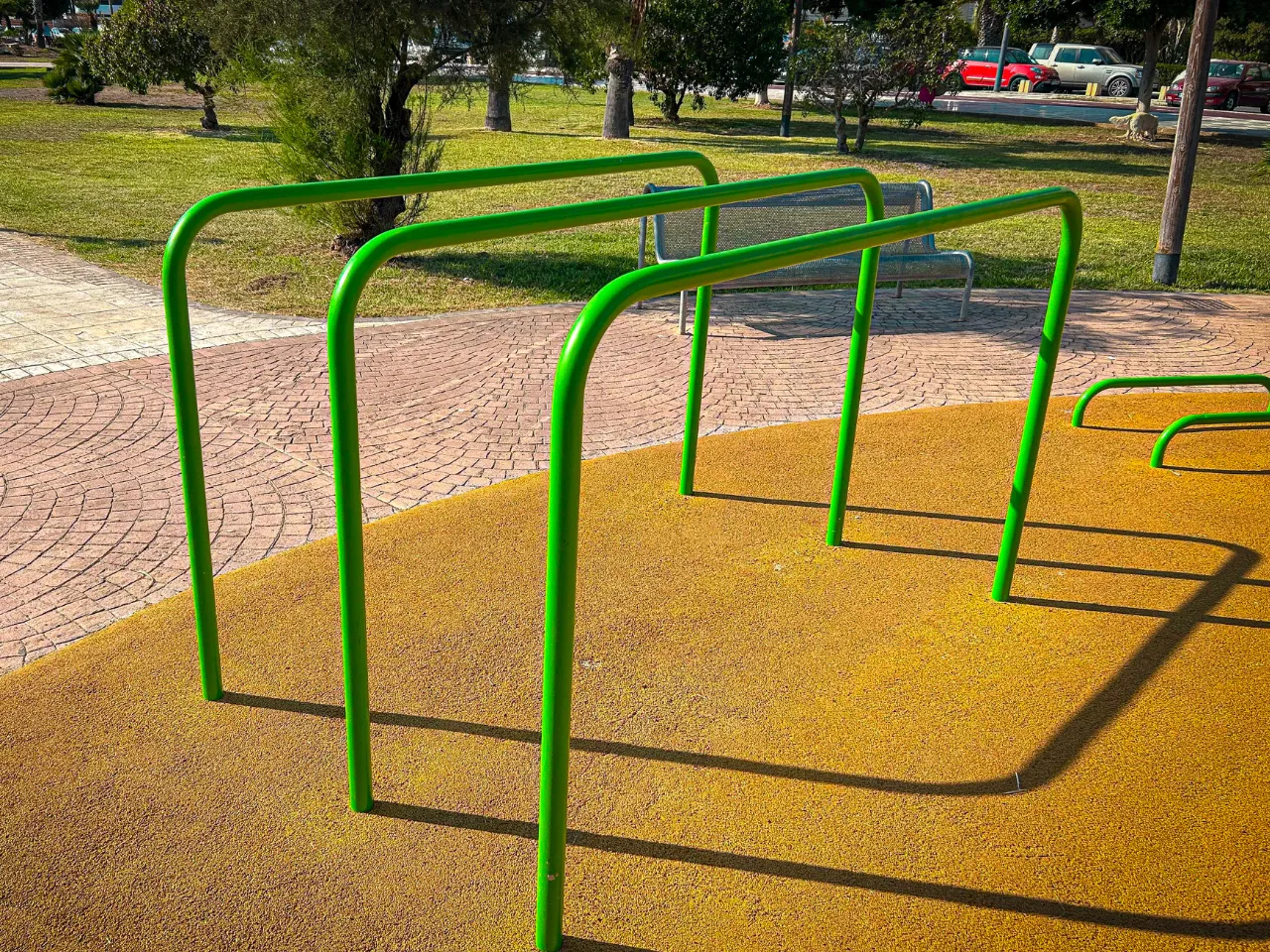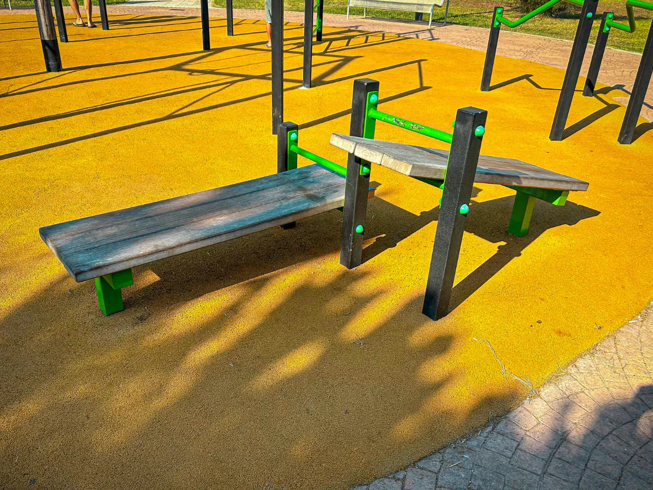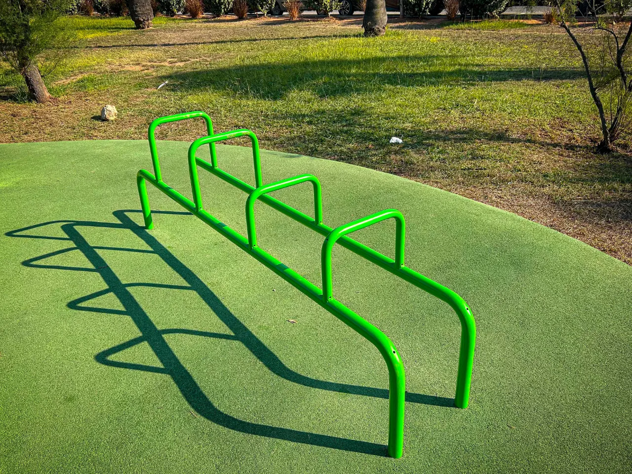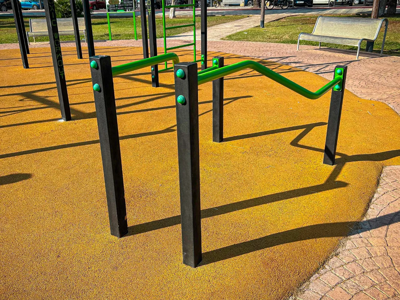 Las barras están instaladas sobre un suelo de caucho, algo áspero, pero no tendrás problema con los ejercicios de movilidad. Para ejercicios de equilibrio como pinos, la superficie es adecuada. Si buscas una base más recta o firme, puedes utilizar alguna acera cercana. Hay espacio de sobra para dejar tus cosas.