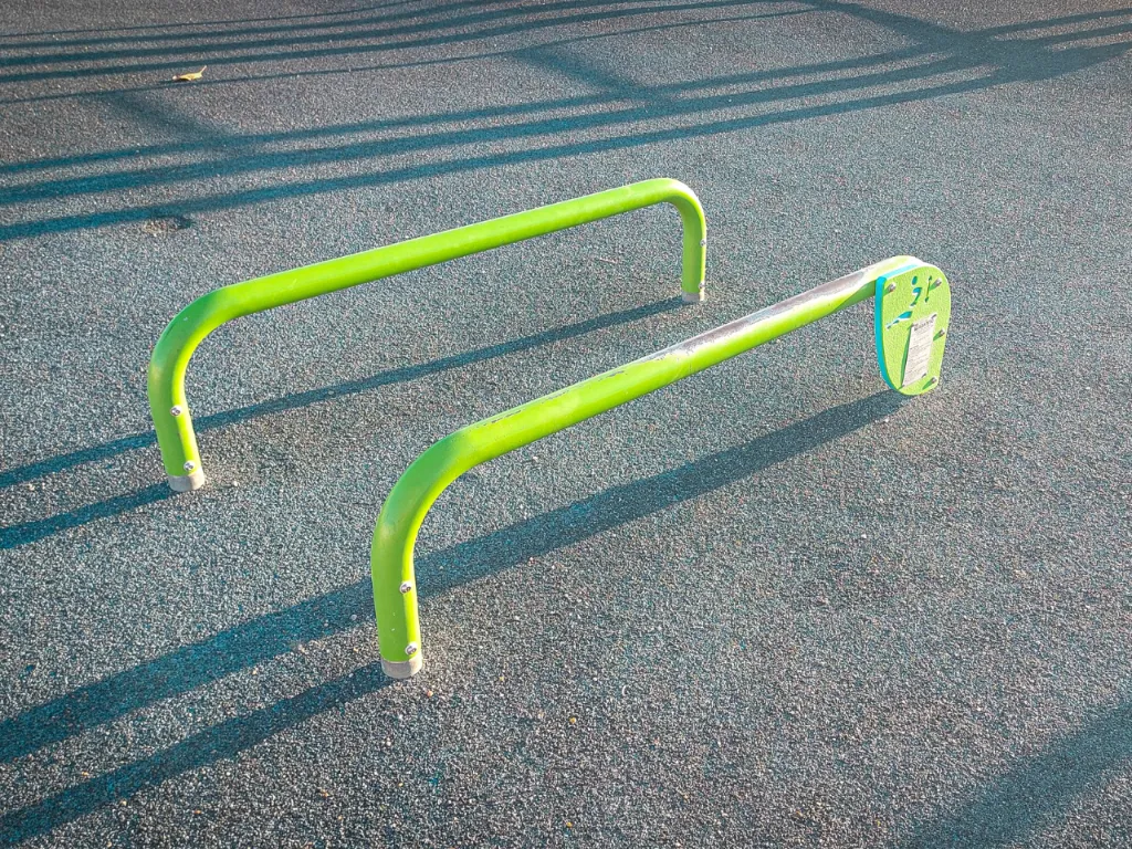 En su instalación nos encontramos con un complejo compuesto por barras a diferentes alturas para dominadas, barras snake, barras monkey, una espaldera o pared sueca, una barra con anillas, una paralela de suelo y una doble paralela adaptada.