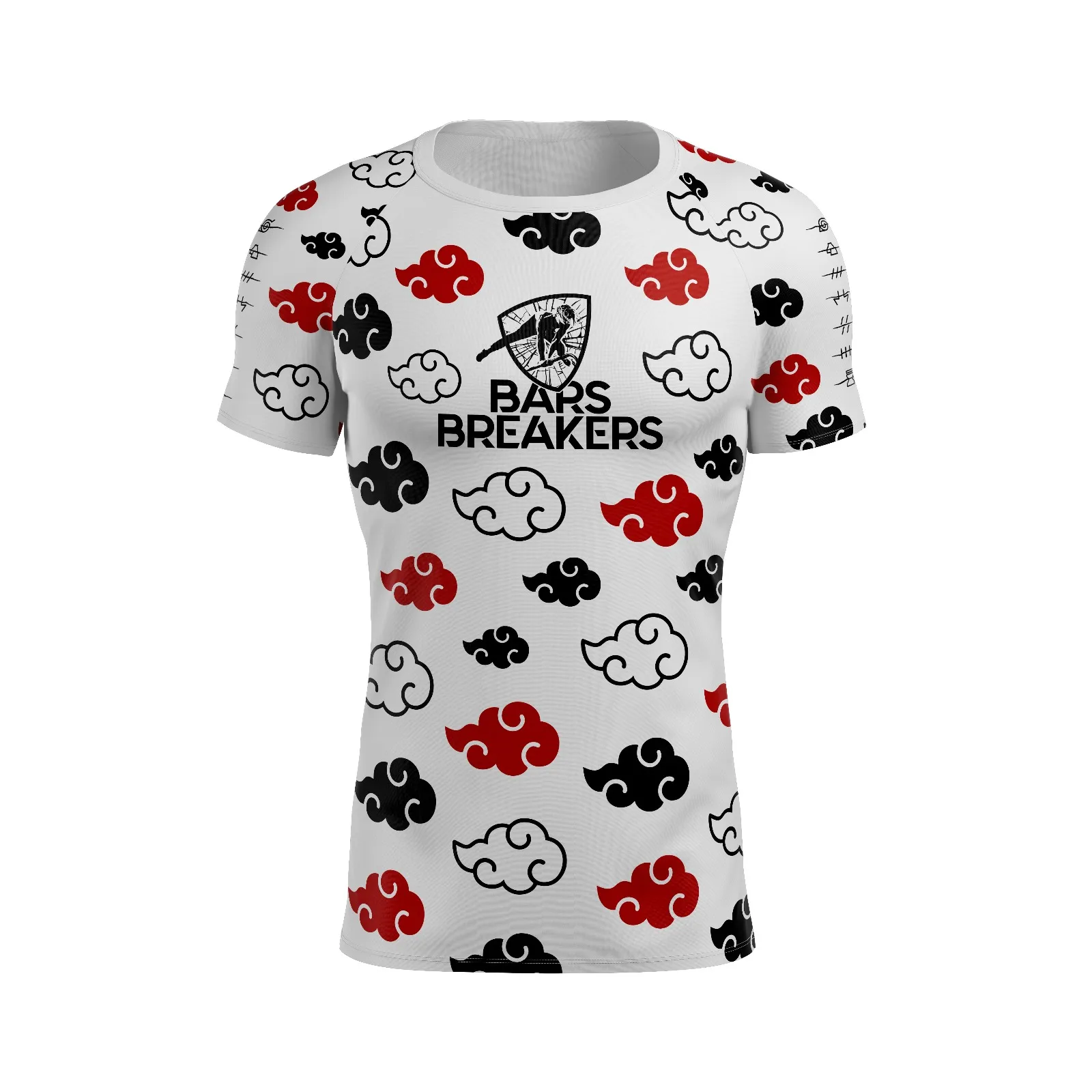 Te presentamos la segunda camiseta oficial del Bars Breakers «Nubes», siendo la primera que rinde homenaje a una icónica serie de anime, representando en este caso el universo ninja. Esta camiseta tiene un diseño inspirado en las nubes de la organización «criminal» y también la más poderosa del mundo «shinobi», además añadimos los símbolos tachados de las villas ocultas en las mangas, de las cuales formaban parte los ninjas fugitivos más fuertes, tal y como portan en sus bandanas.
